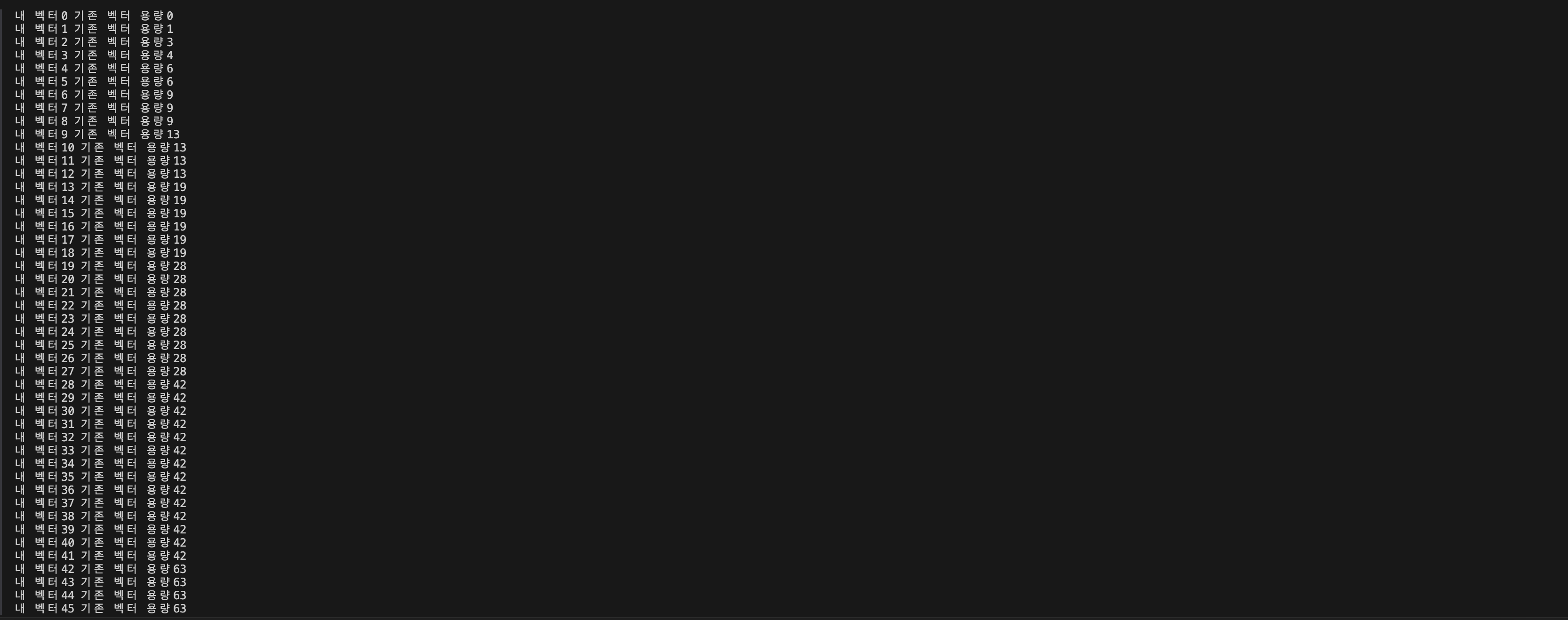 cout << "기존 라이브러리 벡터" << v[i] << " 기존 벡터 용량" << v.capacity() << endl;