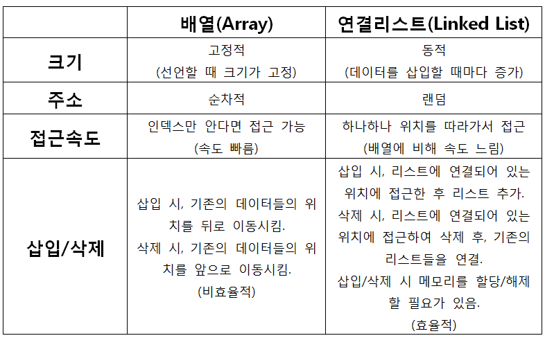 위 표는 배열과 연결리스트의 차이점들을 정리해둔 표입니다.