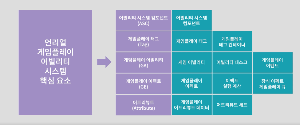 - 액터가 소유하고 발동할 수 있는 어빌리티 및 액터 간의 인터랙션 기능을 제공하는 프레임워크이다.