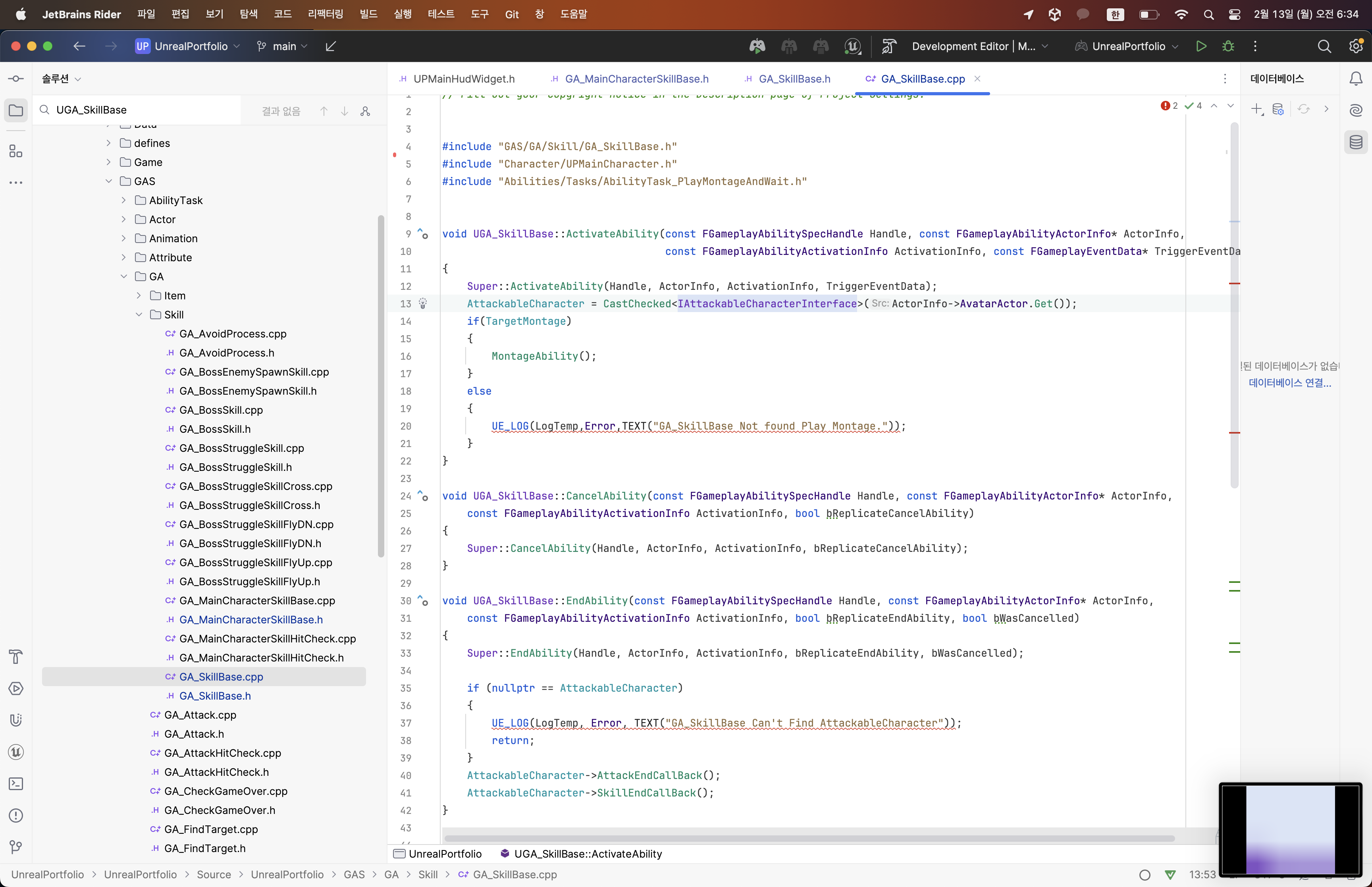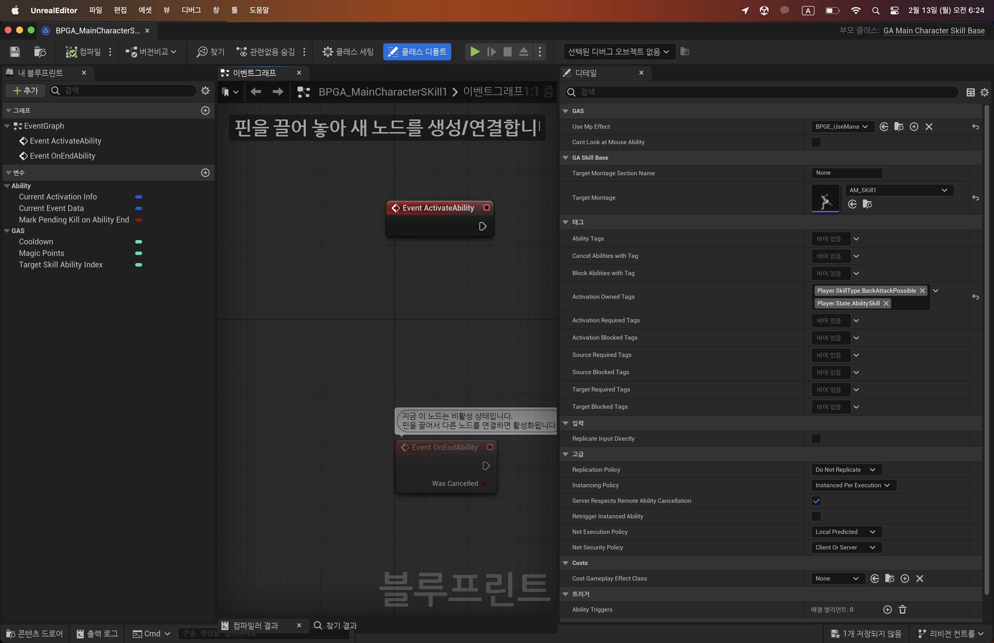 제가 만든 GameAbility의 역할은 해당 GA스킬의 몽타주가 재생됩니다, GA의 정의된 소모마나만큼 플레이어의 mp를 차감합니다. 스킬 발동이후 쿨타임이 재생됩니다.