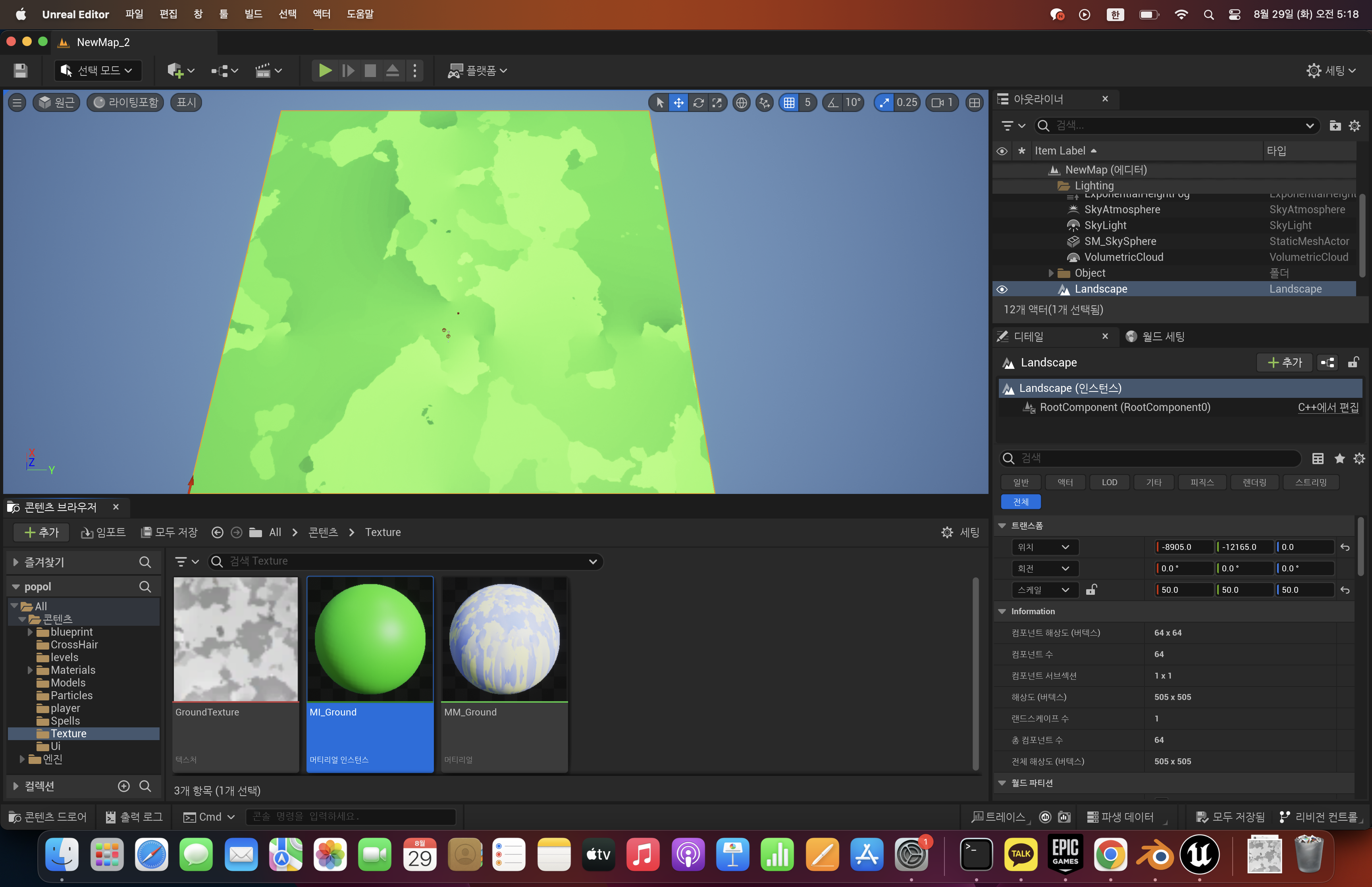 2. 디테일에서 랜드스케이프 머티리얼을 방금 디자인한 MI_Ground를 선택