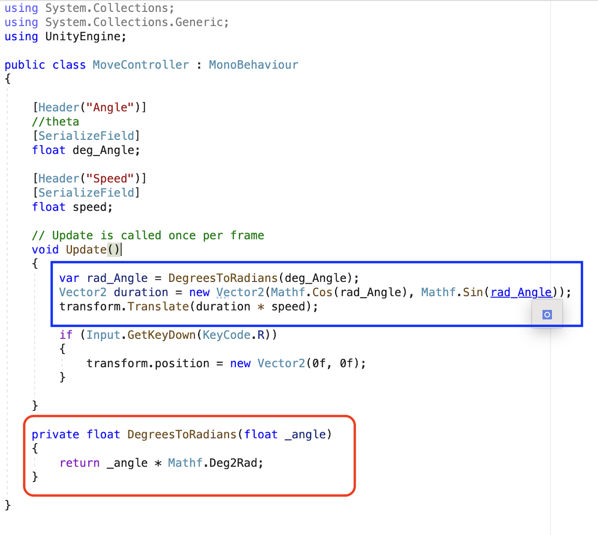 유니티 mathf cos,sin은 라디안법을 사용하고 디그리를 사용하지 않습니다.